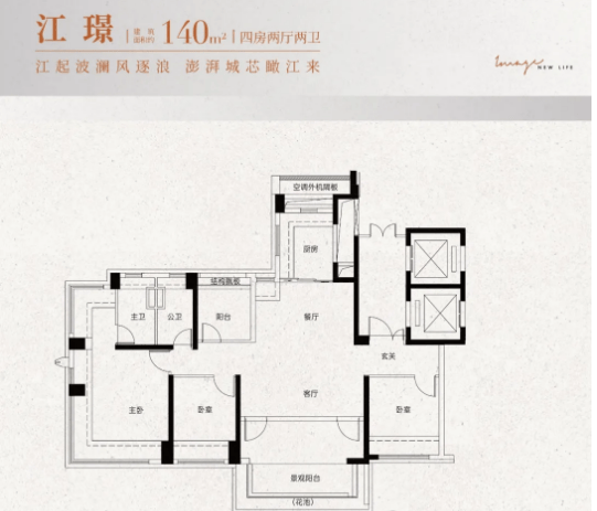 建面约120㎡户型(涵盖118㎡、122㎡相近户型):该户型为四房两厅两卫设计,面向改善型业主。户型采用四开间朝南设计,居住与生活区域动静分离,保证了居住的私密性和舒适度。空间布局科学合理,客厅宽敞明亮,连接南向大阳台或南北双阳台,通风采光极佳;主卧带270°飘窗,可享270度环幕江景视野,提升居住品质。122㎡户型的阳台宽度更是超过7米,为业主提供了广阔的观景和活动空间,得房率高达114%,空间利用率极高。